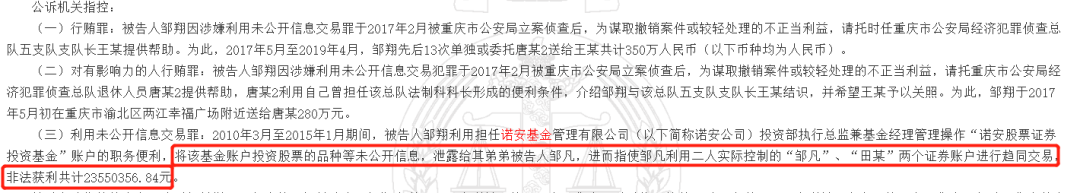 7年前,诺安基金管理有限公司(下称“诺安基金”)投资部原执行总监兼基金经理邹翔,将未公开信息泄露给弟弟邹某(化名),进而指使邹某利用二人实际控制的两个证券账户进行趋同交易,非法获利共计2355.04万元。