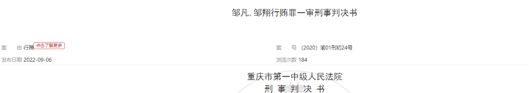 2021年9月,重庆市第一中级人民法院对该案做出一审判决,邹翔犯利用未公开信息交易罪、行贿罪等,被执行有期徒刑11年,并处罚金1445万元,邹某被判处有期徒刑3年,并处罚金1445万元,两人违法所得约2355.04万元全部追缴。