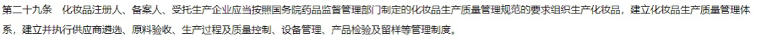 不少行业人士表示,这主要是依据《化妆品监督管理条例》的要求,化妆品注册人、备案人对化妆品的质量安全和功效宣称负责。同时,化妆品注册人、备案人、受托生产企业应当按照国务院药品监督管理部门制定的化妆品生产质量管理规范的要求组织生产化妆品,建立化妆品生产质量管理体系,建立并执行供应商遴选、原料验收、生产过程及质量控制、设备管理、产品检验及留样等管理制度。