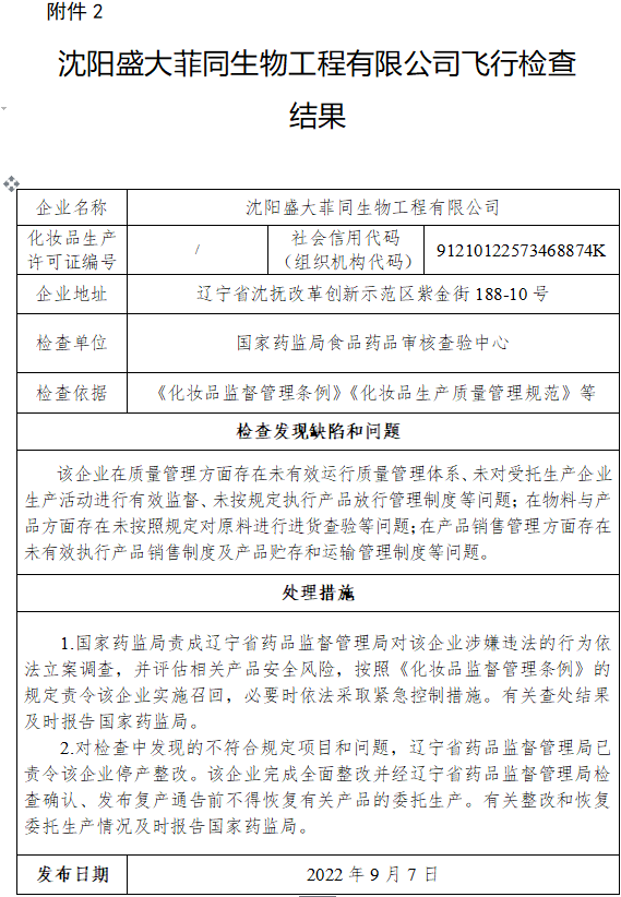 近日,国家药监局通报沈阳盛大菲同生物工程有限公司、沈阳爱华化妆品有限公司两家企业的飞行检查结果,两家企业均被依法立案调查,并停产整改。