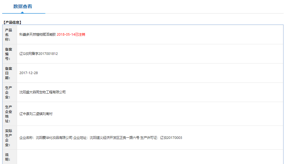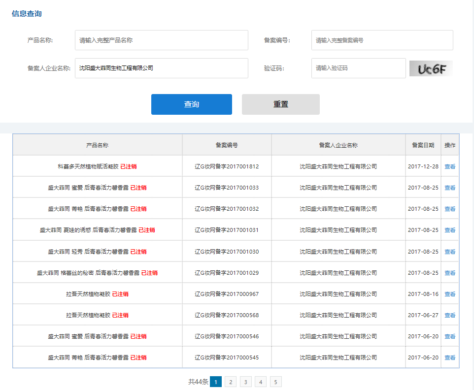 值得注意的是,在国家药监局普通化妆品备案信息平台,青眼注意到,盛大菲同共备案44个产品,不少产品生产方为沈阳爱华化妆品公司,其中,最新一款产品备案日期为2017年12月,注销日期为2018年5月。