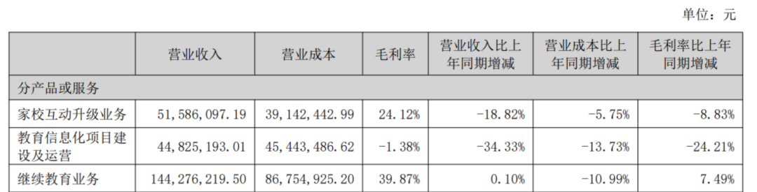从分业务来看,继续教育业务依然是营收贡献最高的业务,报告期内共营收1.44亿元,同比增长0.1%,占总营收比重为58.9%;教育信息化项目建设与运营业务营收4482.52万元,同比减少34.33%,占总营收比重为18.3%;家校互动升级业务营收5158.61万元,同比减少18.82%,占总营收的21.06%。