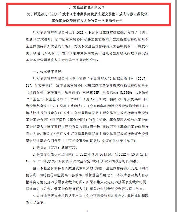 广发基金表示,会议投票表决起止时间:自2022年9月14日起,至2022年10月17日15:00止(投票表决时间以本次大会指定的收件人收到表决票时间为准)。不过,本次议案须经参加本次持有人大会的本基金基金份额持有人或其代理人所持表决权的三分之二以上(含三分之二)通过,存在无法获得持有人大会表决通过的可能。