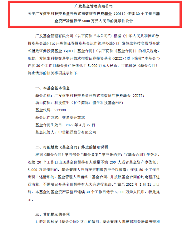 9月8日,嘉实 H 股 50ETF(159823)也发布提示性公告称,截至9月6日,该基金连续40个工作日基金资产净值低于5000万元,可能触发基金合同终止情形。