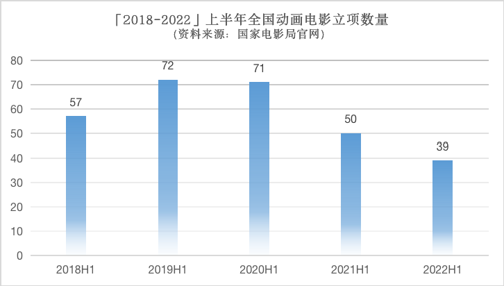 从整体数量上来看,今年上半年的39部是近5年来,全国动画电影立项数量最少的上半年,甚至比去年上半年还少了10多部,而2019和2020年上半年,这一数值均超过了70。