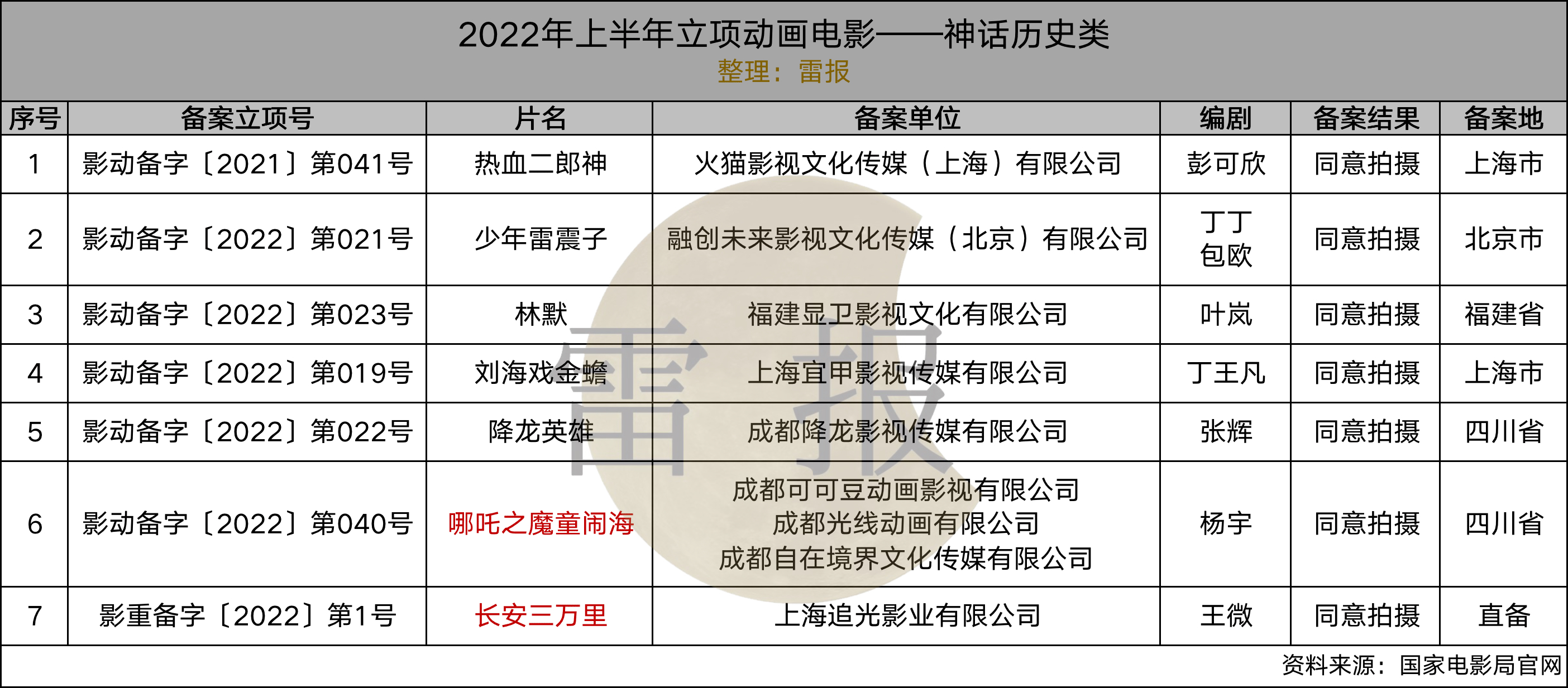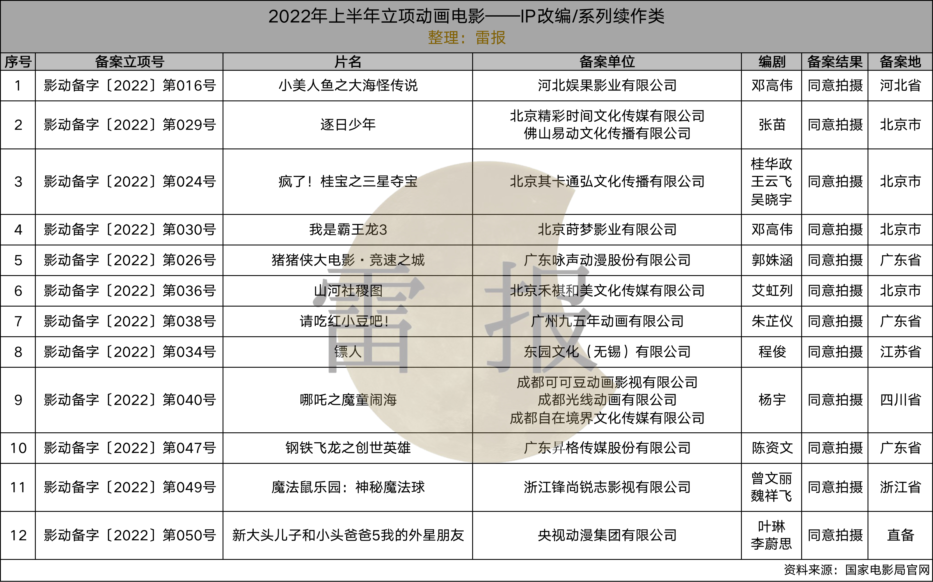 9月初,国家电影局已公布完毕1-6月全国电影剧本(梗概)的备案、立项情况,雷报经过统计后得知,2022上半年,共有39部“动画电影”备案通过,其中一月4部,二月15部,三月9部,五月11部。涵盖《哪吒之魔童闹海》、《镖人》、《请吃红小豆吧!》等作品。