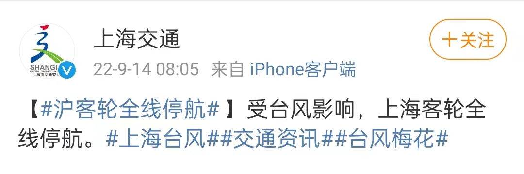 上海交通9月14日消息,受台风影响,上海客轮全线停航。