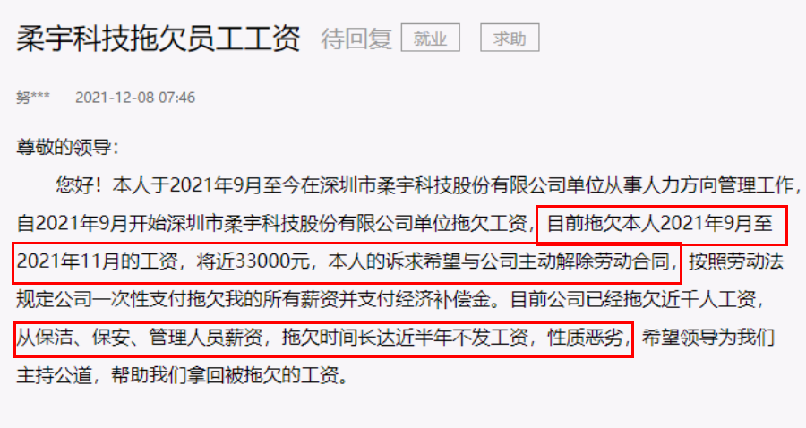 一份人民网上的求助留言,掀开了柔宇欠薪的冰山一角。