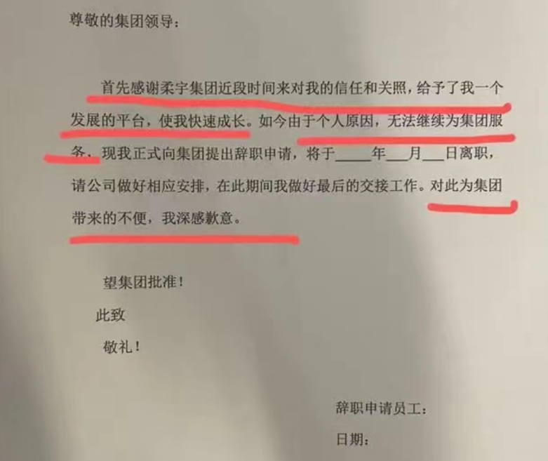 柔宇科技对于主动离职的员工,要求签一个辞职信,“由于个人原因,无法继续为集团服务……对此为集团带来的不便,我深感抱歉。”
