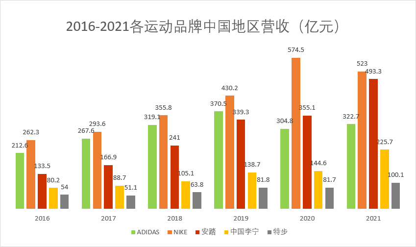具体来看,2021年安踏集团整体营收达到493亿元,同比增长39%,安踏营收即将反超耐克在大中华区的营收;李宁增速最快全年营收226亿元,同比增长56%;特步营收100亿元,同比增长23%。