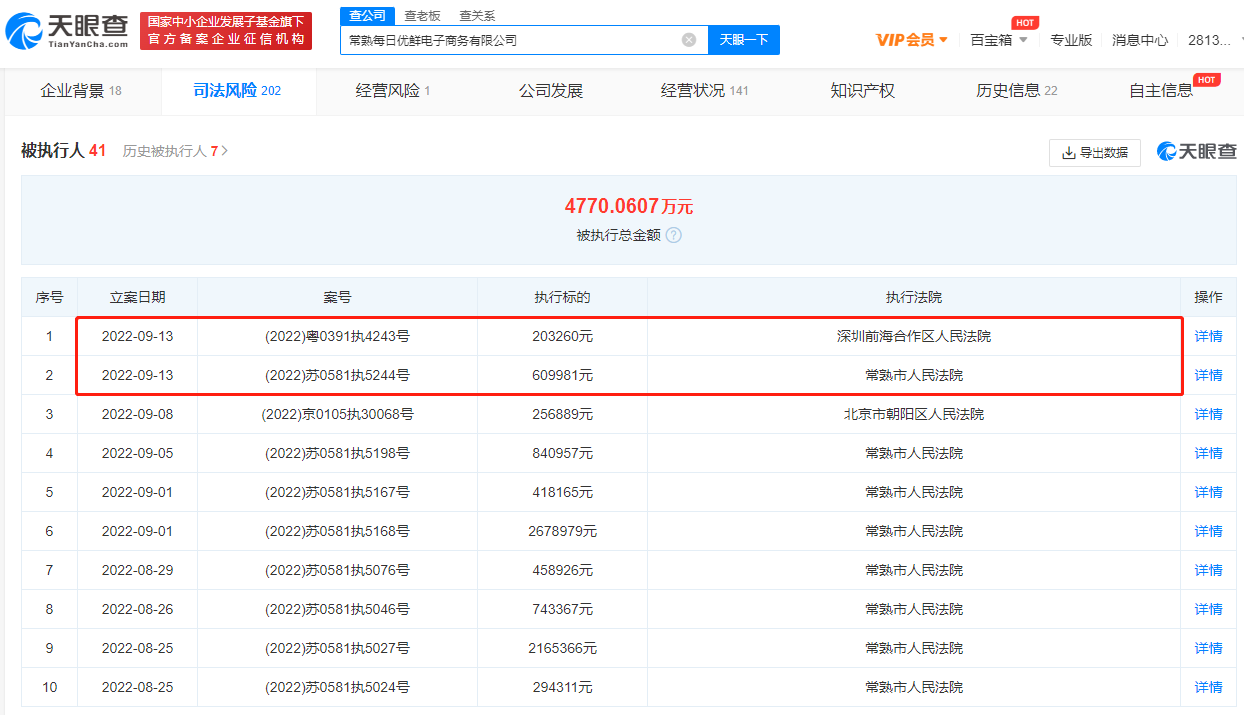天眼查App显示,近日,常熟每日优鲜电子商务有限公司新增两条被执行人信息,执行标的总计81万余元,执行法院分别为深圳前海合作区人民法院、常熟市人民法院。截至目前,该公司已存在41条被执行人信息,被执行总金额超4770万元。