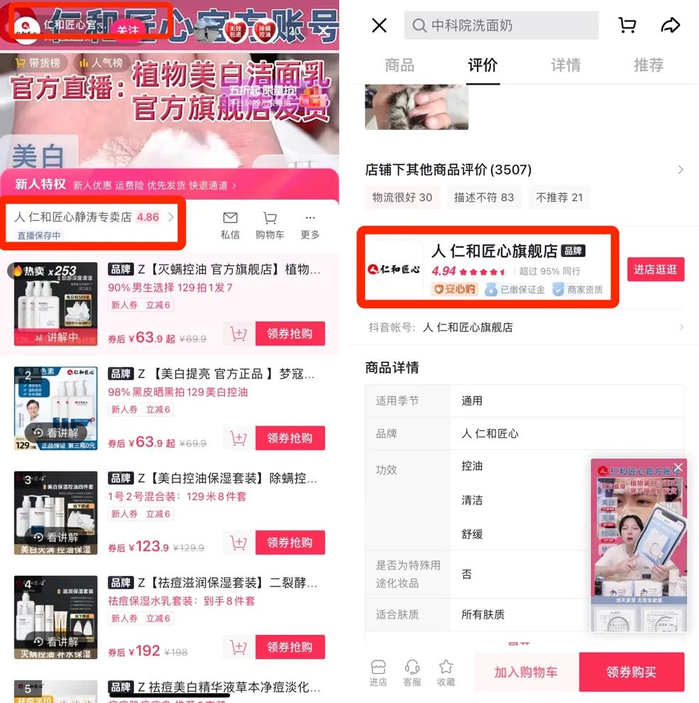 不过,上述大部分专卖店或旗舰店最终目的乃是为官方旗舰店导流。解数咨询发现,当如关联人仁和匠心静涛专卖店的“仁和匠心官方账号”在直播时,其小黄车挂卖的商品实际上是“人仁和匠心旗舰店”的商品。