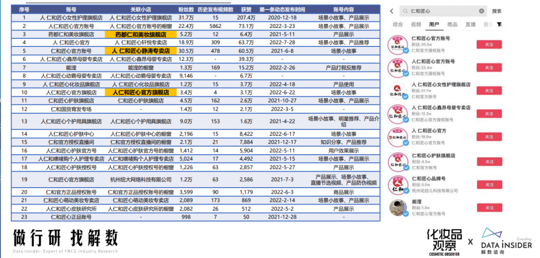 基于授权代理模式,截至目前,人仁和匠心在抖音的代理账号已达25个,且这些账号一致凸显人仁和匠心品牌,强调仁和集团背书,自发堆高品牌声量。