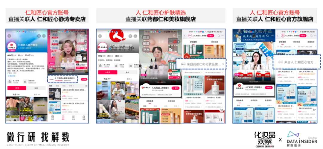 如上文所述,人仁和匠心已布局分销矩阵,但更为重要的是,每一分销商都设置了独立的抖店。如,仁和匠心官方账号关联了人仁和匠心静涛专卖店、人仁和匠心护肤精选以及药都仁和美妆旗舰店。