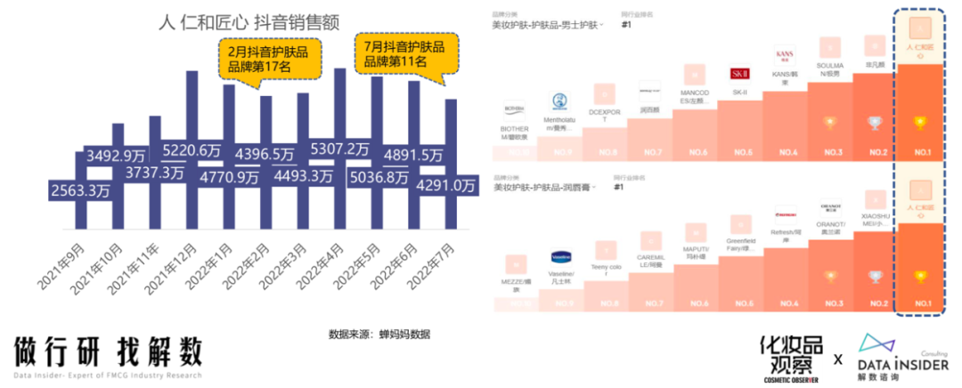 解数咨询数据显示,近一年(2021年8月-2022年8月),一个叫人仁和匠心的药企OEM品牌,在抖音频频斩获佳绩: