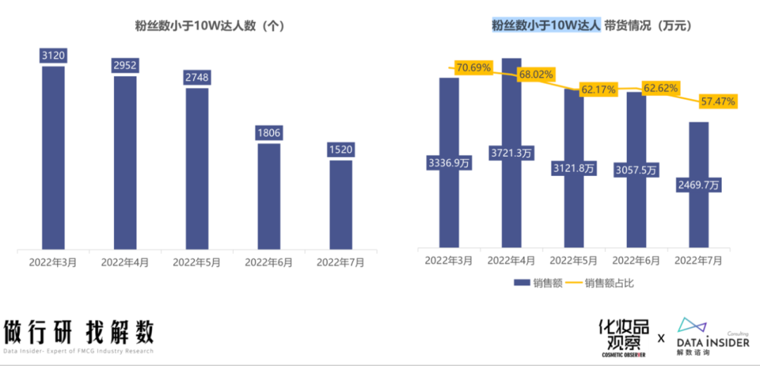 解数咨询数据显示,人仁和匠心品牌60-70%的销售收入除依靠品牌代理外,还依靠各种类型的KOC。如,2022年3月,人仁和匠心便投放了3120位粉丝数小于10W的达人。当月, KOC贡献的销售额占比高达70.69%。不过,由于品牌不自营的性质,投放KOC的主体是头部代理商而非品牌自身。