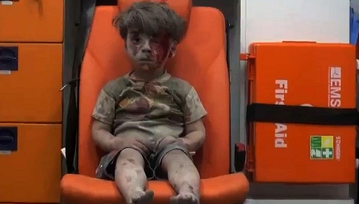 由阿勒颇媒体中心(Aleppo Media Center)传出来的短视频中,五岁的奥姆兰·达格尼诗(OmranDaqneesh)满身灰尘和血迹,被救援人员从一堆废墟中抱到救护车上。他好像没有看到面前的记者镜头,一度眼神涣散,似乎没有从震惊中缓过来。随后他摸向左额的伤口,低头看了看手上的血迹,然后把血抹在了橙红色的救护椅上。