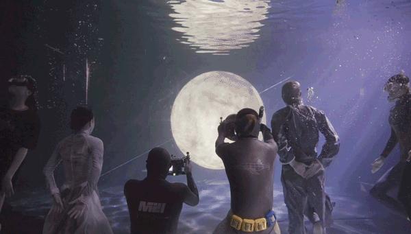 拍摄一个角度,就要将超大月亮从水中吊起再放入水下,一次微小变动则需要花半小时的时间完成,一次因为水压问题,在挪动月亮的时候道具直接碎掉。