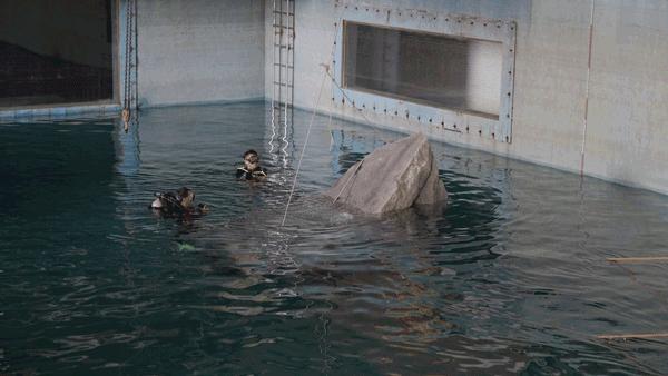 这些道具要求很高,光制作就要1个月,在搭建的时候,需要7名水肺工作人员和14名陆地人员,用两天时间才将它们放置进水中。