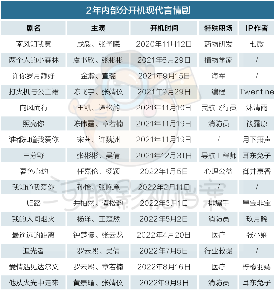 不过另外严雨松也提出,现在平台对定制剧和版权剧的要求的确更高,除了几家头部影视公司之外,大多数项目必须从源头IP的选择和制片人的码盘能力上提出了更高的要求,比如更优质的IP、更头部的编剧和演员等,这些都将是从海量项目中脱颖而出的筹码(参考“2年内部分开机现代言情剧”表格)。