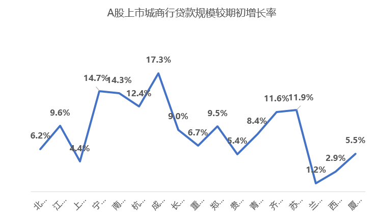从信贷资产的规模的增速来看,17家当中有6家的信贷规模增速是超过10%的,其中成都银行的增速最高,达到了17.3%,是增速最低的兰州银行的14倍有余。