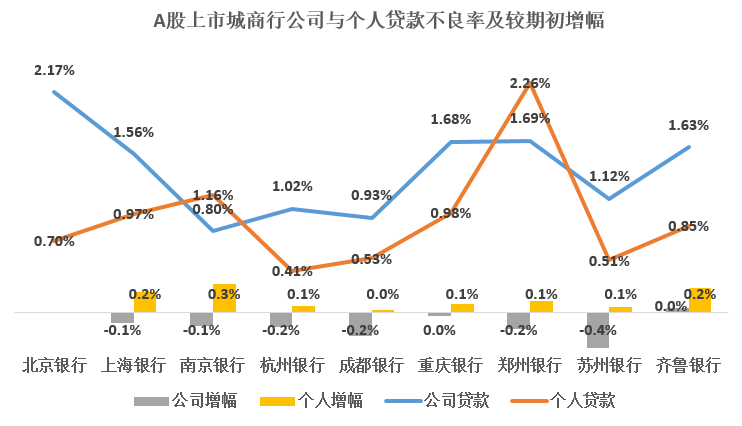 拆分公司贷款与个人贷款来看(因部分城商行未公布公司贷款与个人贷款不良率,仅就公布的分析):北京银行不良率较高,主要是因为公司贷款不良率处于高位;而郑州银行不良率较高,主要是因为个人贷款不良率处于高位,而且个人不良率增幅继续为正值,还在进一步走高,值得关注郑州银行个人贷款信贷质量变化数据。除上述两家外,上海银行、南京银行、齐鲁银行的个人贷款增幅也都超过0.2%,增幅较大,需观察其是否具有连续性。