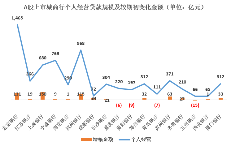 个人经营贷款方面,仅有北京银行一家规模突破了千亿元,其余均在1000亿元以内,不过从增幅来看,即便其规模是17家城商行当中最大的,其增幅也依然呈现高幅增长,达到了131亿元,仅次于上海银行的150亿元。