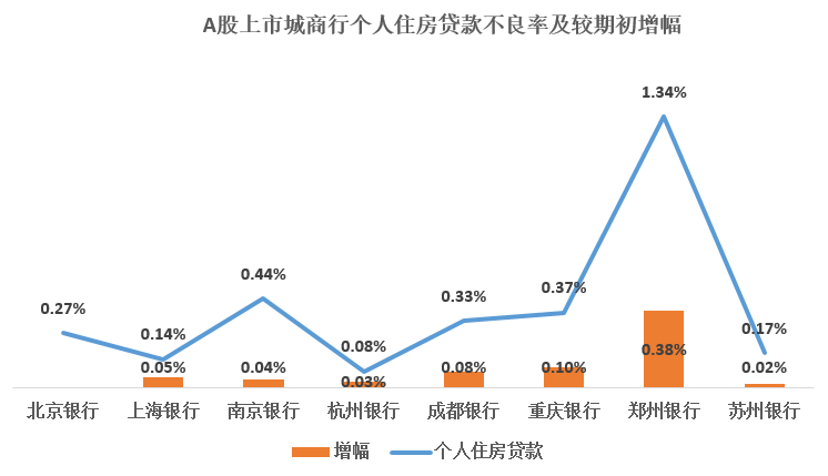 从该指标来看,郑州银行算是一个“异类”,不仅最新一期不良率处于可比城商行当中最高的位置,高达1.34%,其增幅也是最高的,高达0.38%,增幅甚至超过部分城商行的整体房贷不良率,再考虑到其个人住房贷款占个人贷款的比重达到50%左右,郑州银行后期化解住房贷款违约风险的压力显然不小。
