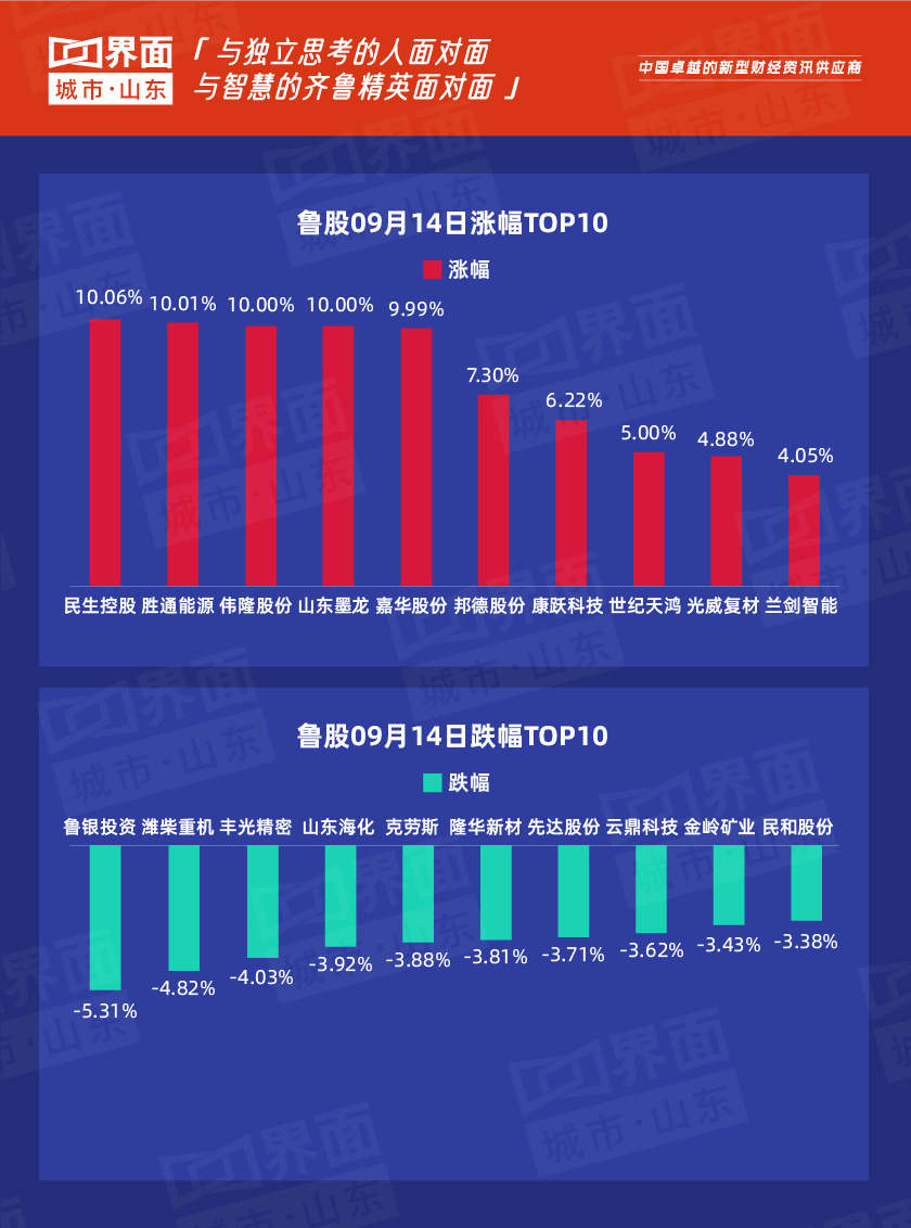 青岛市涨幅榜首:民生控股(000416),涨幅10.06%,股价5.36元,总市值28.51亿元;