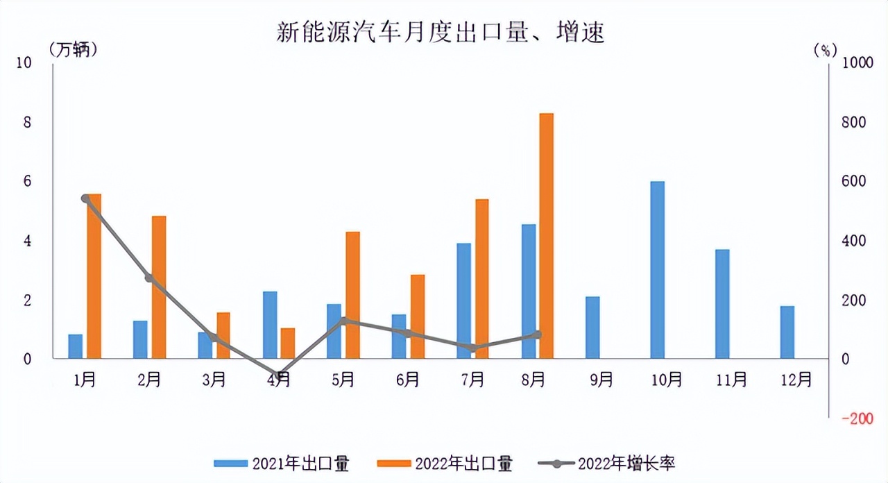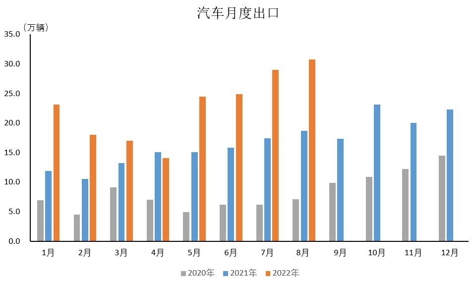 中国汽车工业协会数据显示,2022年8月,汽车出口30.8万辆,环比增长6.2%,同比增长65%。2022年1-8月,汽车企业出口181.7万辆,同比增长52.8%。主力依然是乘用车,2022年8月,乘用车出口26万辆,2022年1-8月,乘用车出口144.6万辆。