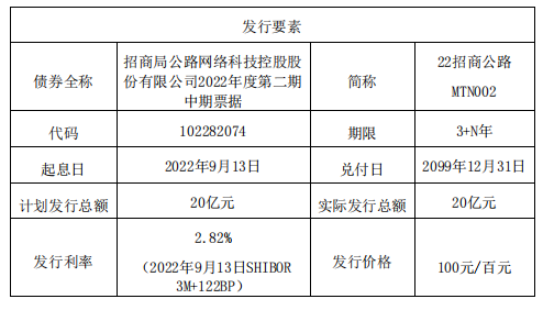 招商公路9月14日公告,2022年9月8日-2022年9月9日,公司完成发行了2022年度第二期中期票据,实际发行总额20亿元,发行利率2.82%(2022年9月13日SHIBOR3M+122BP),期限3+N年。