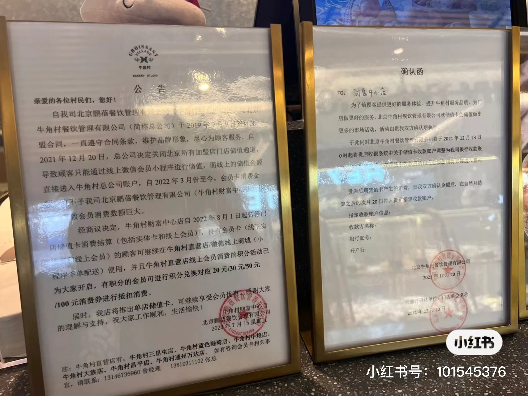 小红书平台有网友在今年8月表示,北京的加盟门店无法使用原先的会员储值卡。一份牛角村财富中心门店贴出的通知显示,该门店属于北京鹏蓓餐饮管理有限公司在2019年9月签署合同的加盟店。