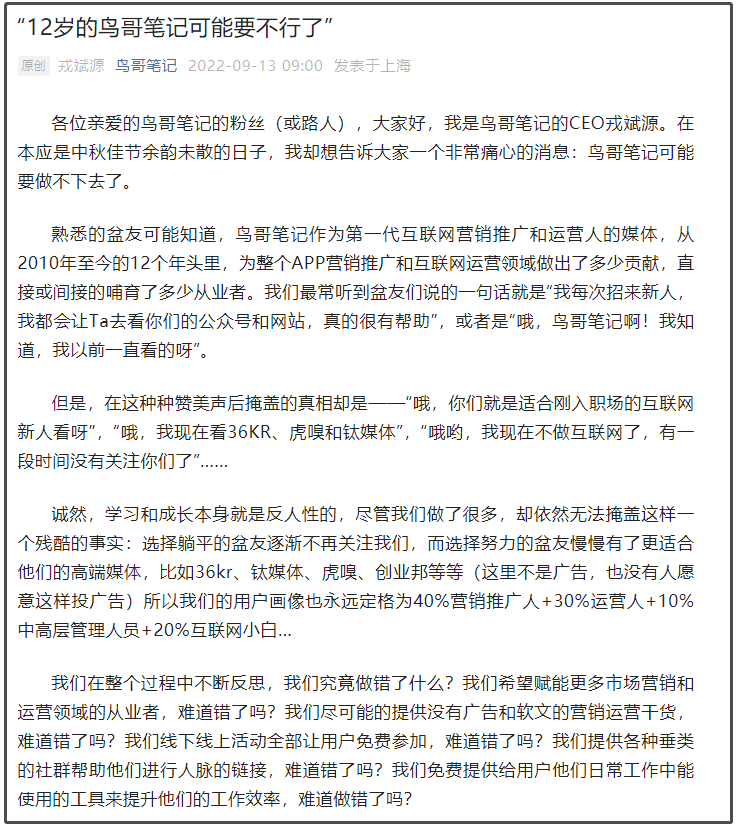 9月13日,知名移动互联网知识分享平台鸟哥笔记创始人CEO戎斌源在公众号发文称:“鸟哥笔记可能要做不下去了”。同时对外透露,在过去12年里,鸟哥笔记“每年平均亏损400万元”。