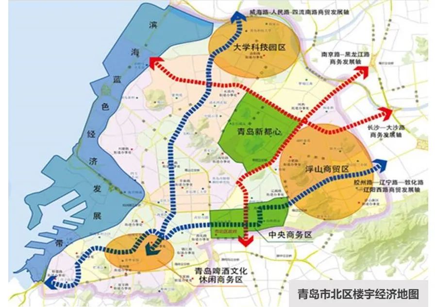 依托中央商务区、青岛新都心、浮山商贸区等核心商圈发展楼宇经济,其中中央商务区打造一批新航运、新贸易、新金融、新信息等不同优势特色的产业集群。滨海蓝色经济发展带规划发展科技商务聚集区、创意文化体验区。