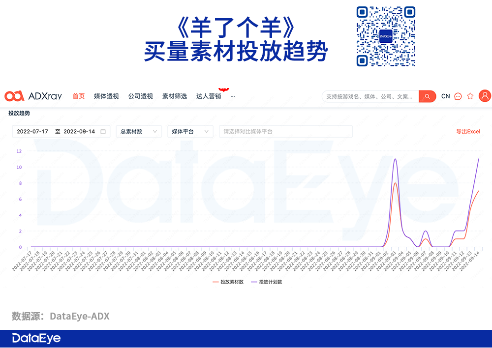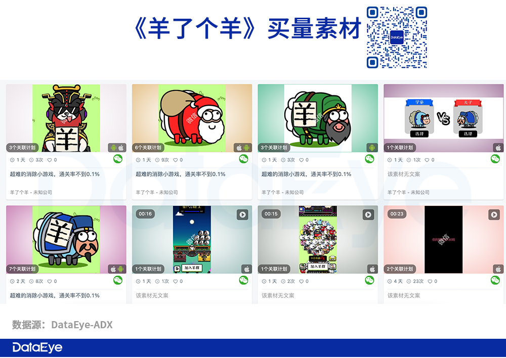 DataEye-ADX显示,截至14号《羊了个羊》素材投放与投放次数(计划数)总体都不多,属于“蜻蜓点水”式买量,投入极少。