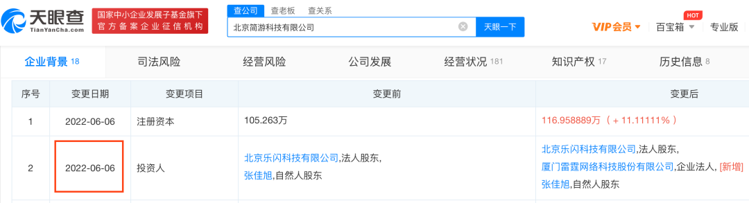 天眼查显示,该公司股东信息中,由张佳旭、厦门雷霆网络科技股份有限公司、北京乐闪科技有限公司共同持股。其中厦门雷霆网络于今年6月入股,持有简游科技10%的股份,为第二大股东。