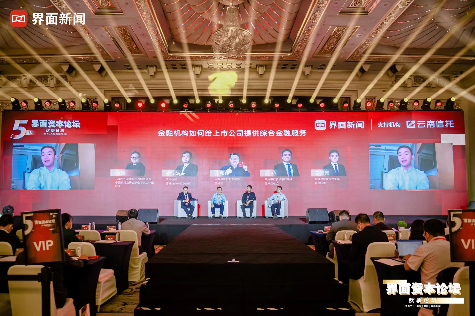 2022年9月8日,由上海报业集团|界面新闻主办、云南信托作为支持企业、盟浪可持续数字科技作为支持机构的第五届【界面资本论坛】秋季论坛在昆明中维翠湖宾馆圆满落幕。云南信托战略客户总部总经理、中国银行业协会双碳专家工作组成员徐曦;云南信托信托业务一部总经理楼宇波;云南信托研究发展部总经理王和俊;平安银行投资银行事业部产品总监范裕;兴银理财项目投资部投资经理姜亮亮围绕“金融机构如何给上市公司提供综合金融服务” 展开探讨。