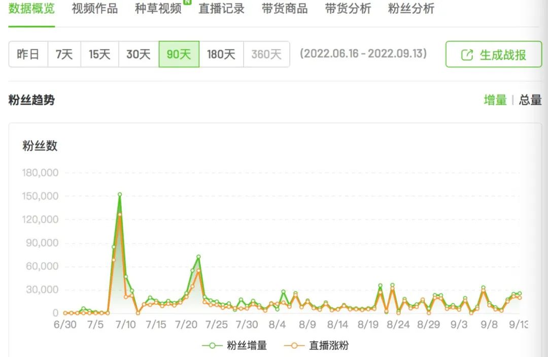 7月8日,当一众品牌还在寻找流量新出口时,“东方甄选之个护美妆” 更名为“东方甄选美丽生活”,开启了首场直播带货。飞瓜数据显示,次日,该号迎来新的粉丝高峰,单日增粉15W。