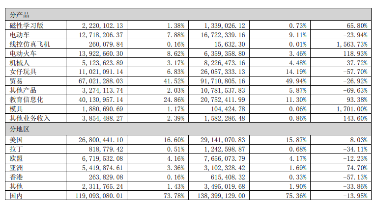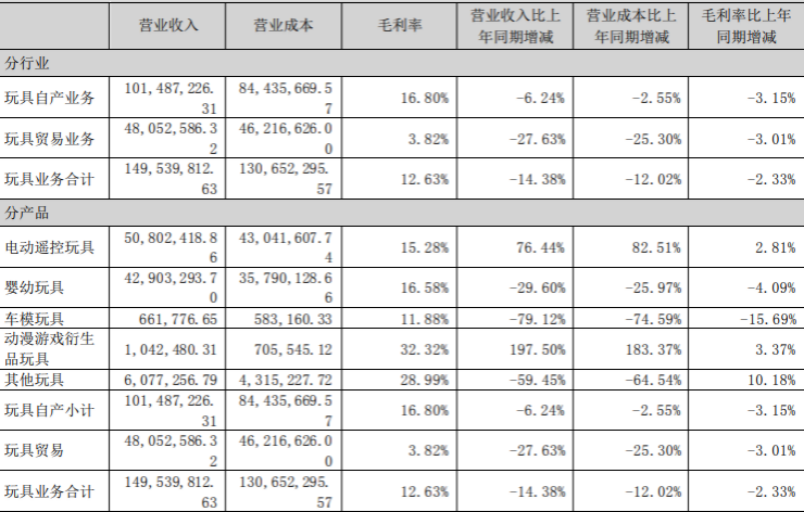 报告期内,玩具及相关业务营收1.19亿元,占公司总营收的73.45%,同比下降27.22%。分产品划分,模具销售收入达到188.07万元,同比增长1701.00%,主要是因为模具车间对外销售收入增加所致;机械人、女仔、其他产品及分地区中拉丁美洲、其他等销售收入同比下降,主要是受国外疫情影响,订单减少所致。