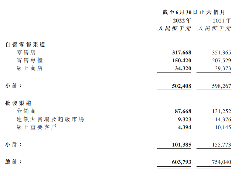 按渠道划分,自营零售渠道收入达到5.02亿元,同比减少16.0%,其中零售店收入为3.18亿元,下跌9.6%,寄售专柜收入为1.50亿元,下跌27.5%,线上商店收入为3432万元,下跌12.8%。