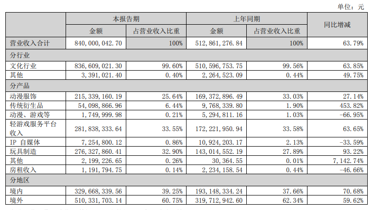 报告期内,玩具及衍生品销售收入占比最高,为5353.66万元,同比下降45.37%,动漫授权、版权及承制收入2428.97万元,同比增长135.84%。