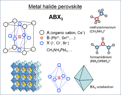 钙钛矿由三种不同的组分组成,我们通常把它定义成ABX3,其中B-X会组成一个正八面体结构。正八面体结构在通过“尖”共享(corner-sharing)形成一个三维的“离子型”晶体,原子之间相互作用力比较弱。B-X键及其组成的钙钛矿结构决定了钙钛矿半导体材料的绝大多数性质。而A组分则嵌入到正八面体之间的空隙之中,通过更弱的氢键和静电吸引与B-X组成的八面体结构相互作用,但是对光电性质贡献相对较小。