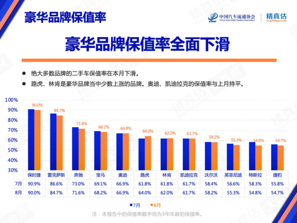 其中,豪华市场保值率下滑趋势最为严重,多家豪华品牌8月保值率均出现了不同程度的下滑。数据显示,8月豪华品牌保值率前三名依旧由保时捷、雷克萨斯与奔驰占据,三者保值率分别达到90.0%、84.7%以及71.6%,其余豪华品牌保值率均在70%以下。