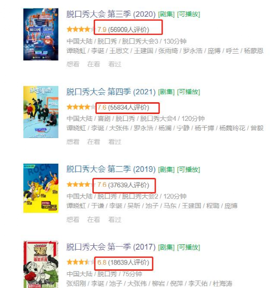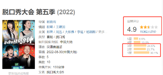 腾讯视频的头部综艺《脱口秀大会》如期迎来第五季。谁也没想到,8月30日开播后,豆瓣打出1星和2星的网友很快超出了一半。截止发稿时间豆瓣仅为4.9分,创下该节目的历史新低。此前,《脱口秀大会》的最高分为7.9,最低分为6.8。
