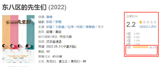 《东八区的先生们》这部剧一开分就一路下跌,从2.4滑到2.2,10万+人中,有超过96%的观众打出1星,成功刷新今年国产剧的最低评分。