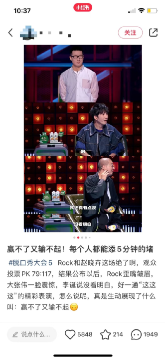 而小红书里,关于《脱口秀5》的笔记已经超过7300+篇,除了参赛选手和节目官方账号外,点赞数较高的笔记也集中在质疑节目的领笑员和公正性上。