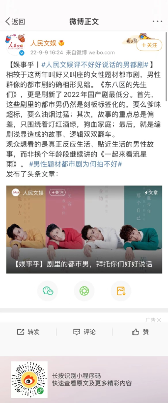 此后,@人民文娱 很快针对剧情中的故事做出了总结:重点偏差,没有内涵,所有的故事情节,都只能围绕灯红酒绿和狗血家庭开展。文娱价值官发现,《东八区的先生们》的第一集开始,就体现了剧本创作者的匮乏。