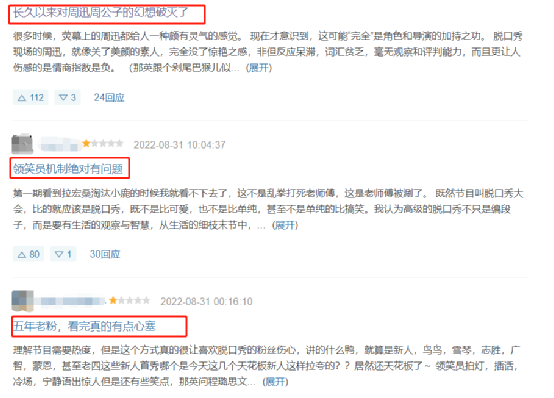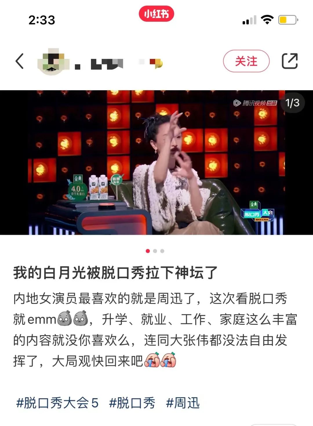 文娱价值官最先感受到观众们的不满情绪,是来自微博、小红书、朋友圈这些社交媒体。节目正片播出前两期后,两位领笑员那英、周迅便引起很大的争议。社交媒体上,网友普遍的反馈是,两位领笑员虽然咖位很大,却不懂脱口秀,拍灯显得过于随意,不珍惜优秀脱口秀演员的付出和努力。也有观众看完节目质疑领笑员这一机制的公正性。