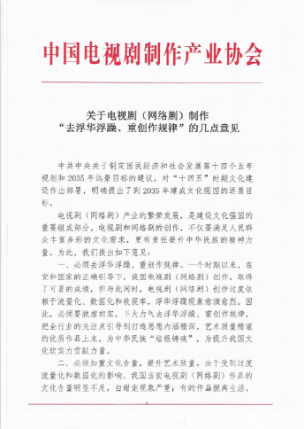 中国电视剧制作产业协会早就出台过管理内容的《关于电视剧制作去浮华、重创作规律,的几点意见》(以下简称:意见),意见指出“电视剧(网络剧)创作过度依赖流量化、数据化和收视率,浮华浮躁现象愈演愈烈”。意见批评了电视剧行业中存在的种种乱象:由于受到过度流量化和数据化的影响,我国当前电视剧(网络剧)作品的文化含量明显不足,白甜宠现象严重;有的作品脱离生活、脱离实际;有的作品架空历史、歪曲历史;甚至有些明显触碰中华民族道德文化底线的作品却能大行其道。