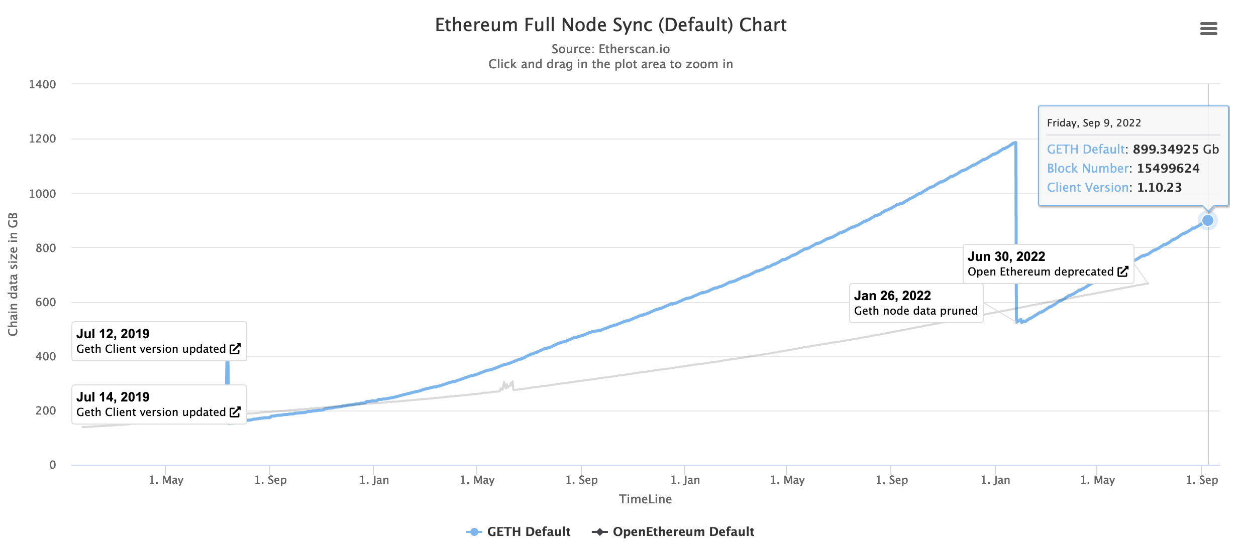 这些打工人中,有一种叫做「全节点」,每一个全节点都保存着以太坊网络完整且最新的数据。2020年5月时,以太坊全节点大小超过了360 GB,并以每月30 GB的速度保持增长,现在已增至超899 GB,而额外存储了每个区块高度的「归档节点」大小已经达到11 TB。
